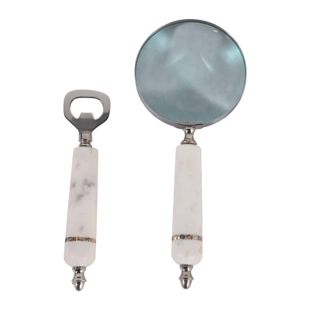 Elegante pieza decorativa que combina una lupa funcional con una base tipo botella y detalles tipo abalone que aportan brillo y sofisticación. Ideal para escritorios, bibliotecas o mesas auxiliares, funcionando como un objeto decorativo distintivo con estilo clásico y moderno.