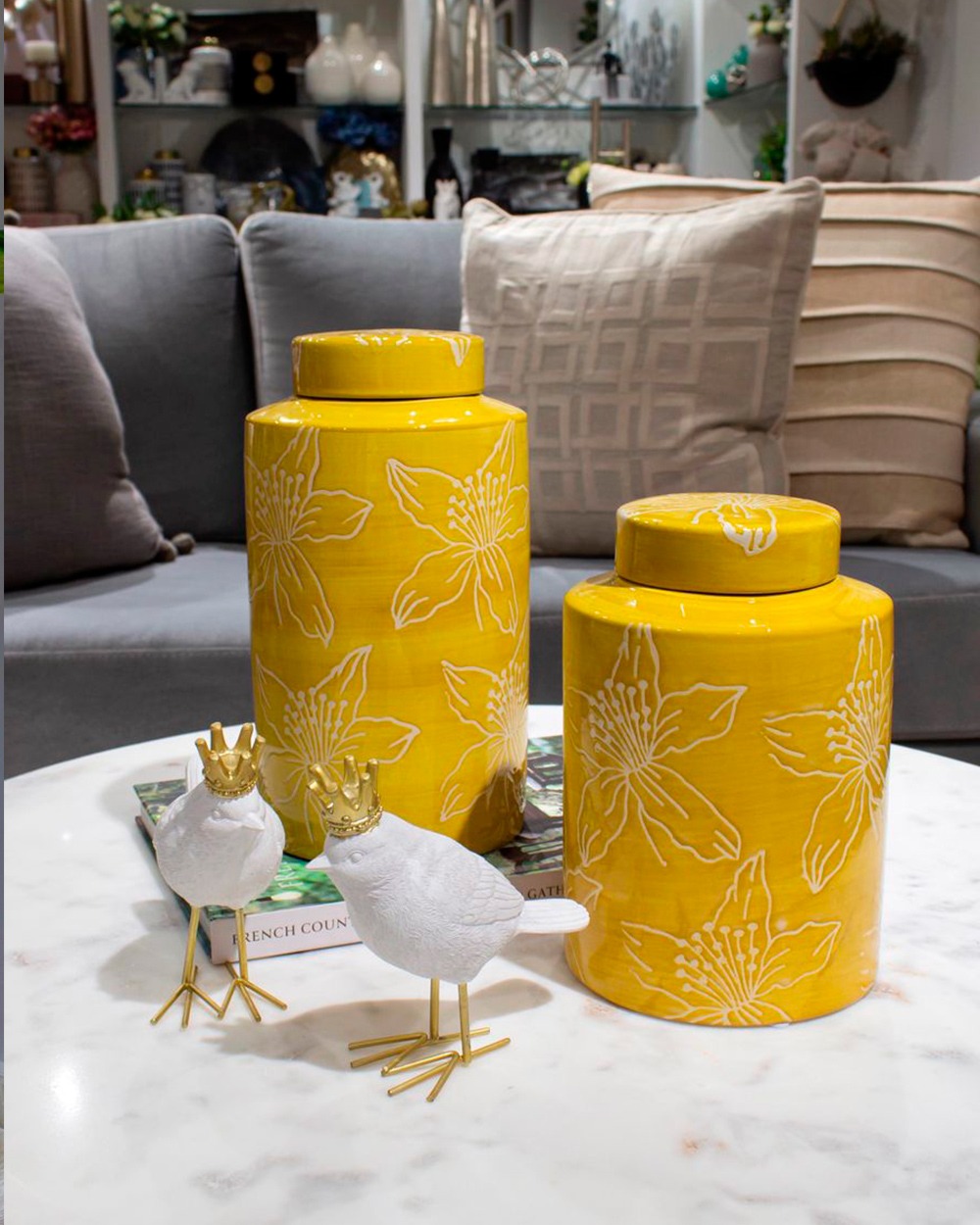 Imponente ánfora amarilla elaborada en cerámica con unas flores blancas, es un accesorio ideal para la decoración de una mesa de centro de sala ,consola o repisa.