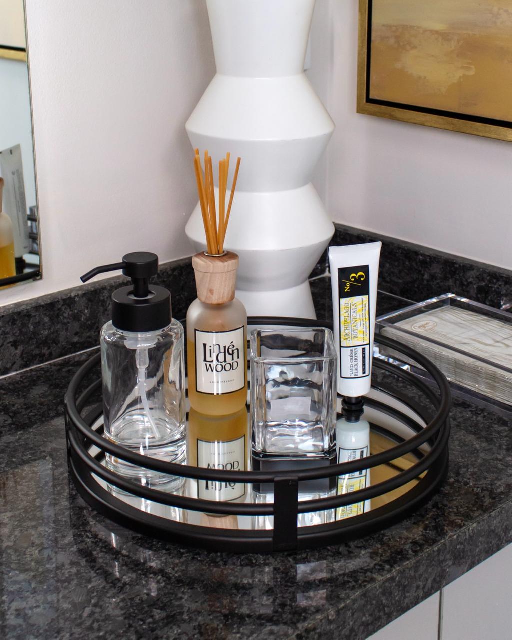 Hermosa bandeja redonda,Elaborada en metal de color negro con una superficie con espejo, esta bandeja puede mejorar enormemente su decoración y agregar un hermoso toque.