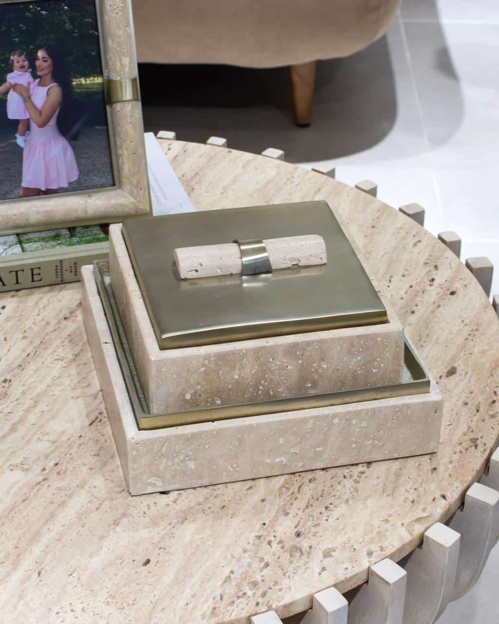 Las cajas decorativas elaborada en travertino con detalles metálicos, combinando materiales naturales con un diseño moderno y sofisticado. Son ideales para organizar pequeños objetos mientras aportan un toque de lujo a mesas de centro, consolas o estanterías.