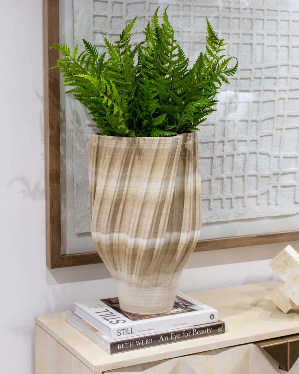 Jarrón decorativo de diseño contemporáneo elaborado mediante impresión 3D, con líneas limpias y modernas que aportan carácter y sofisticación a cualquier espacio.