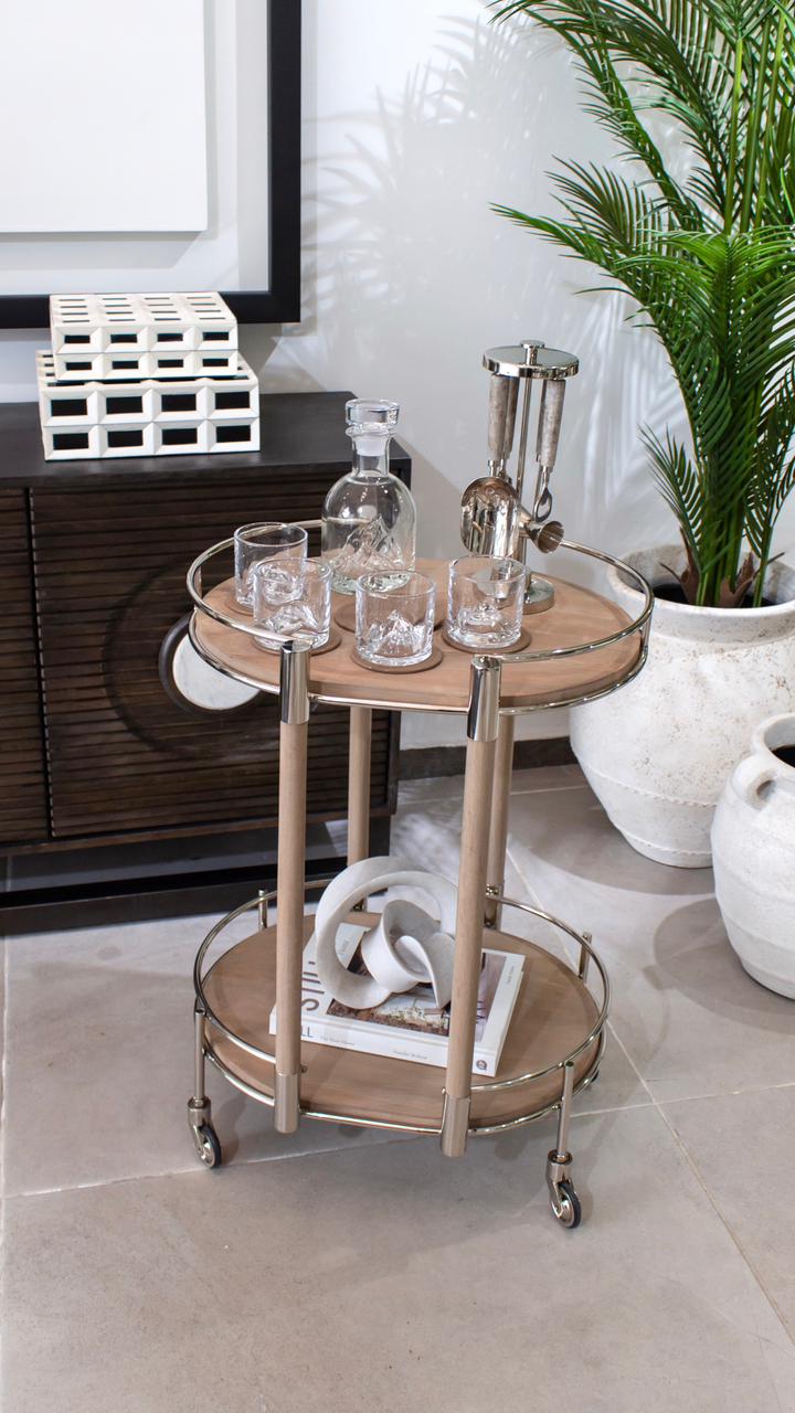 Mesa bar decorativo de diseño moderno y elegante, ideal para servir bebidas o exhibir accesorios decorativos. Su estructura metálica con acabado tipo níquel aporta un estilo sofisticado y contemporáneo, mientras que sus niveles permiten organizar botellas, copas o elementos decorativos. Perfecto para salas, comedores o espacios de entretenimiento.